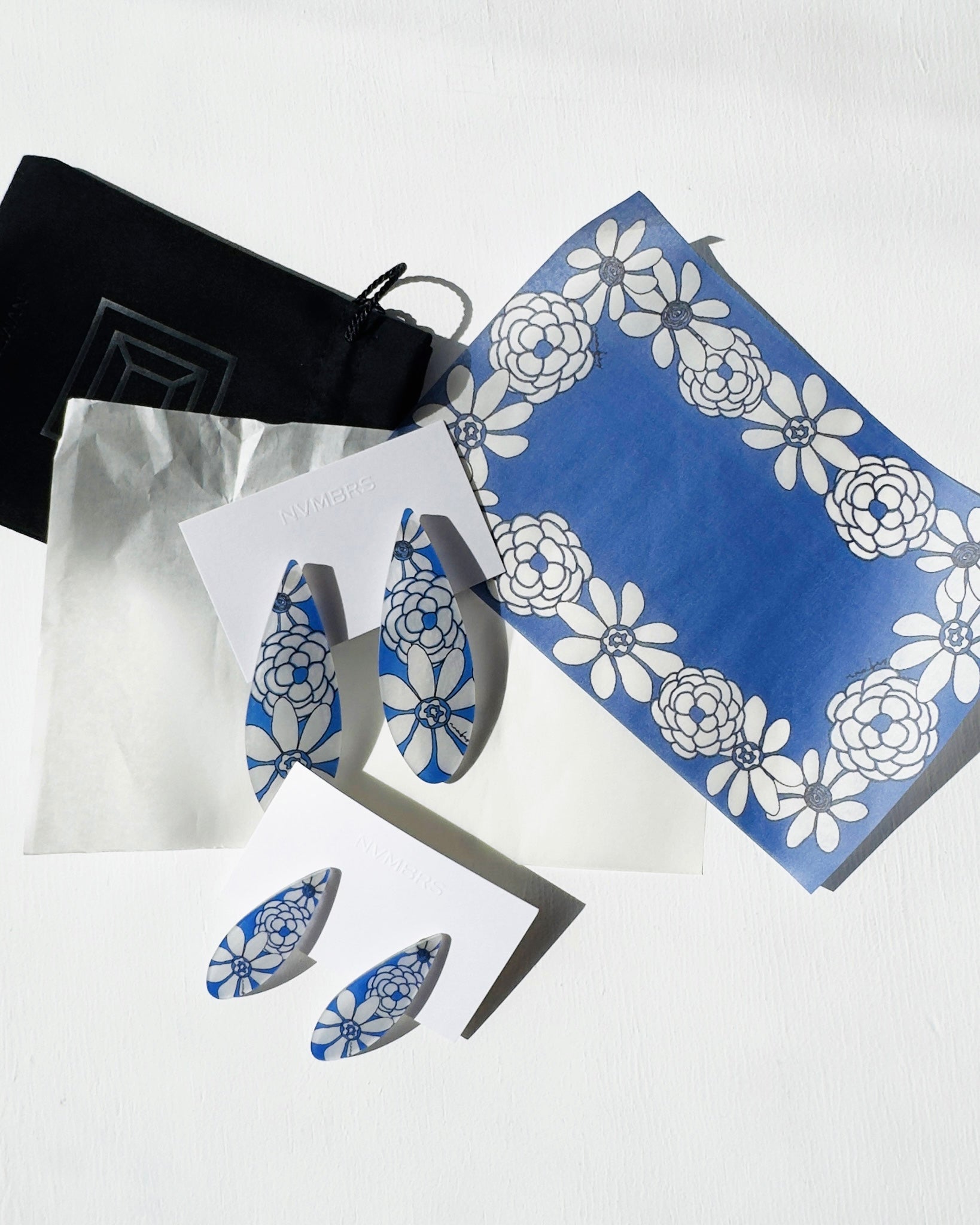 NVMBRS DAISIES ASTER SMALL EARRINGS are aster petal shaped pieces in a daisies floral print inspired by 70's vintage artworks. With a simplistic sleek design and distinctive profile, these aster petal shaped earrings provide a minimalistic approach while leaving the door open for many options to complement the day's attire.